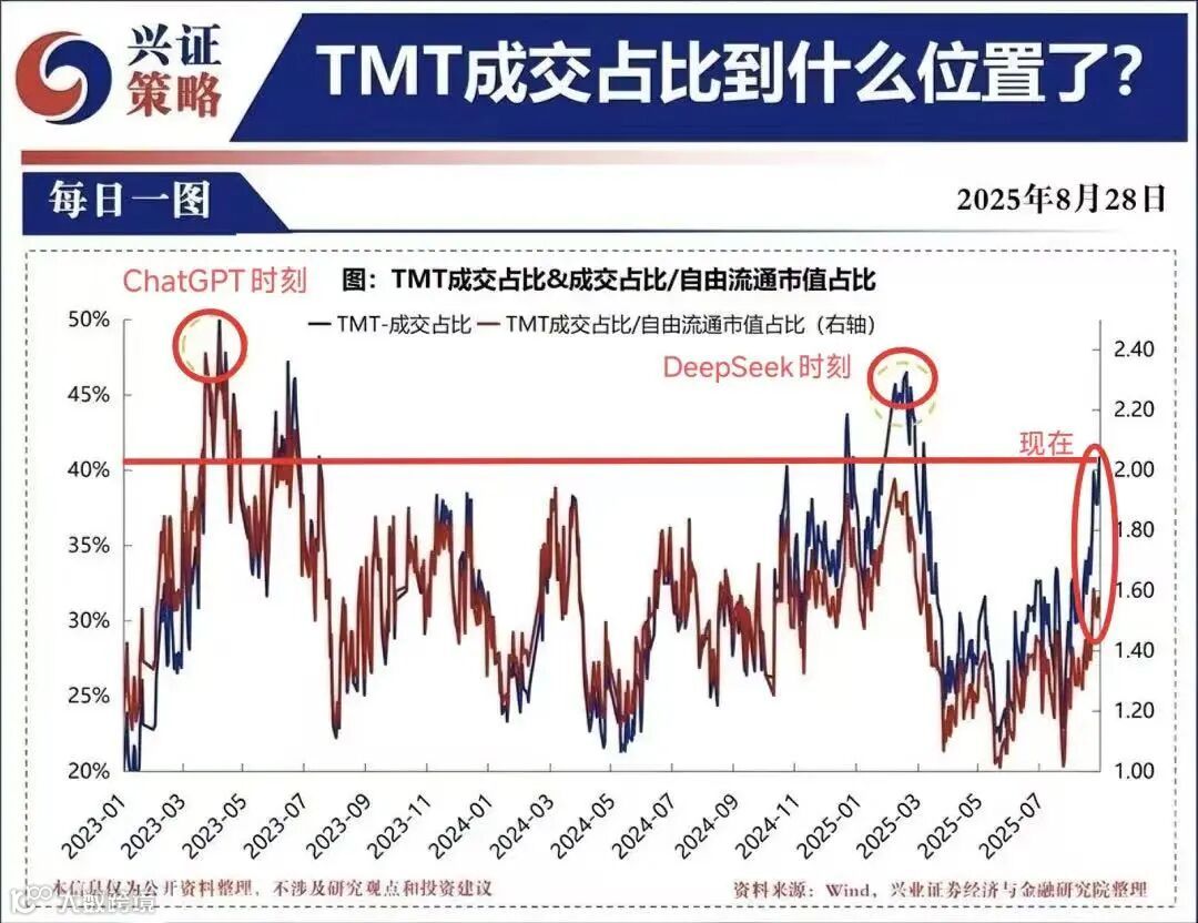 从市场热度来看,目前也是处于危险区间了,从流动性来看,目前整个TMT板块的日成交额,大约占到A股总成交额的41%,而今年初DeepSeek时刻为46.5%,23年炒作ChatGPT时,最高达到50.3%。