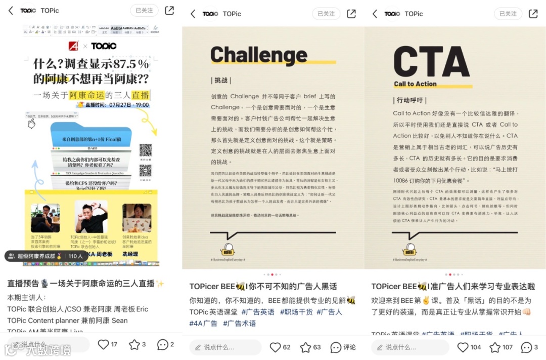 内容不多,估计入驻小红书不久,不过有个栏目吸引了我的注意——「TOPicer BEE」,实际上是广告黑话大科普。