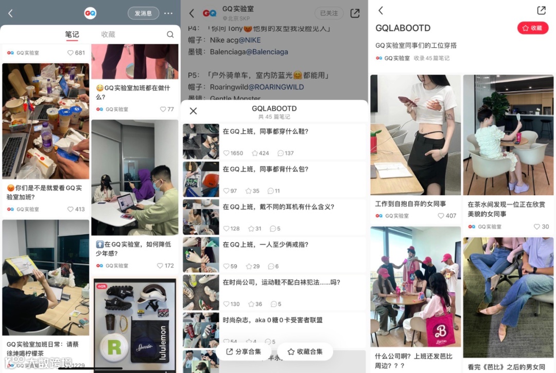 内容很明确,写上班日常、看工位穿搭,AKA时尚捕手。比起“醉生梦死”的加班日记,更吸引我的是后者,GQ的高奢气质,和小红书莫名搭,尤其是图片上的人,人均时尚博主的水平和颜值。