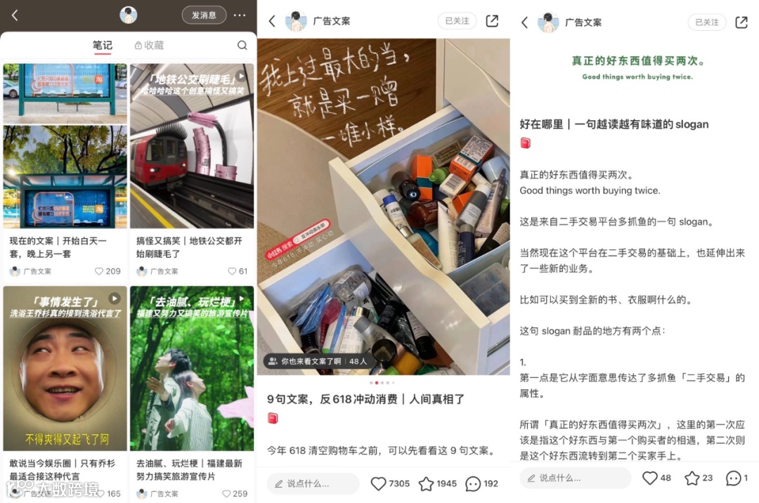 像它的简介所说,“一间广告公司和几个活泼人”,把小红书当日记本来写,带着浓烈的个人化感悟,但又不是私密性的,更多是对生活现象的洞察和新颖的视角。