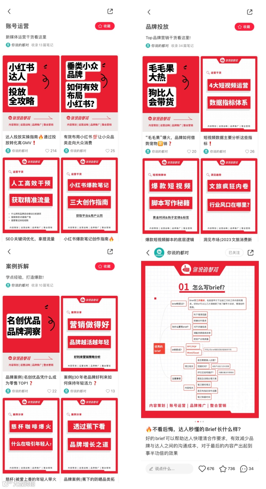 封面和内容都很统一,靠干货吸引粉丝。内容主要分四大类:行业洞察、品牌投放、账号运营、案例拆解。