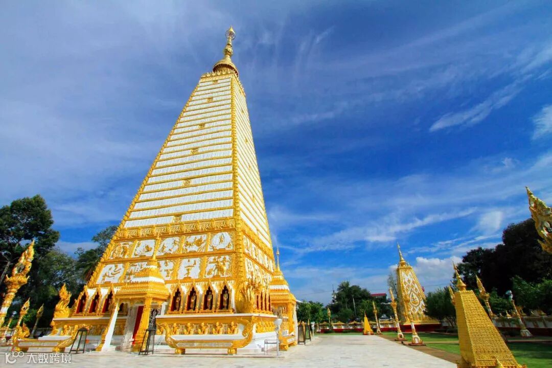 从远方便可以看得见的金碧辉煌的锥形佛塔,是斯玛哈婆佛塔,高56米, 是仿印度摩诃菩提佛塔而造。佛塔周围是乌汶工匠精湛的手工艺雕刻,配以金色花纹边框, 金光灿灿,在傍晚时分尤为美丽。