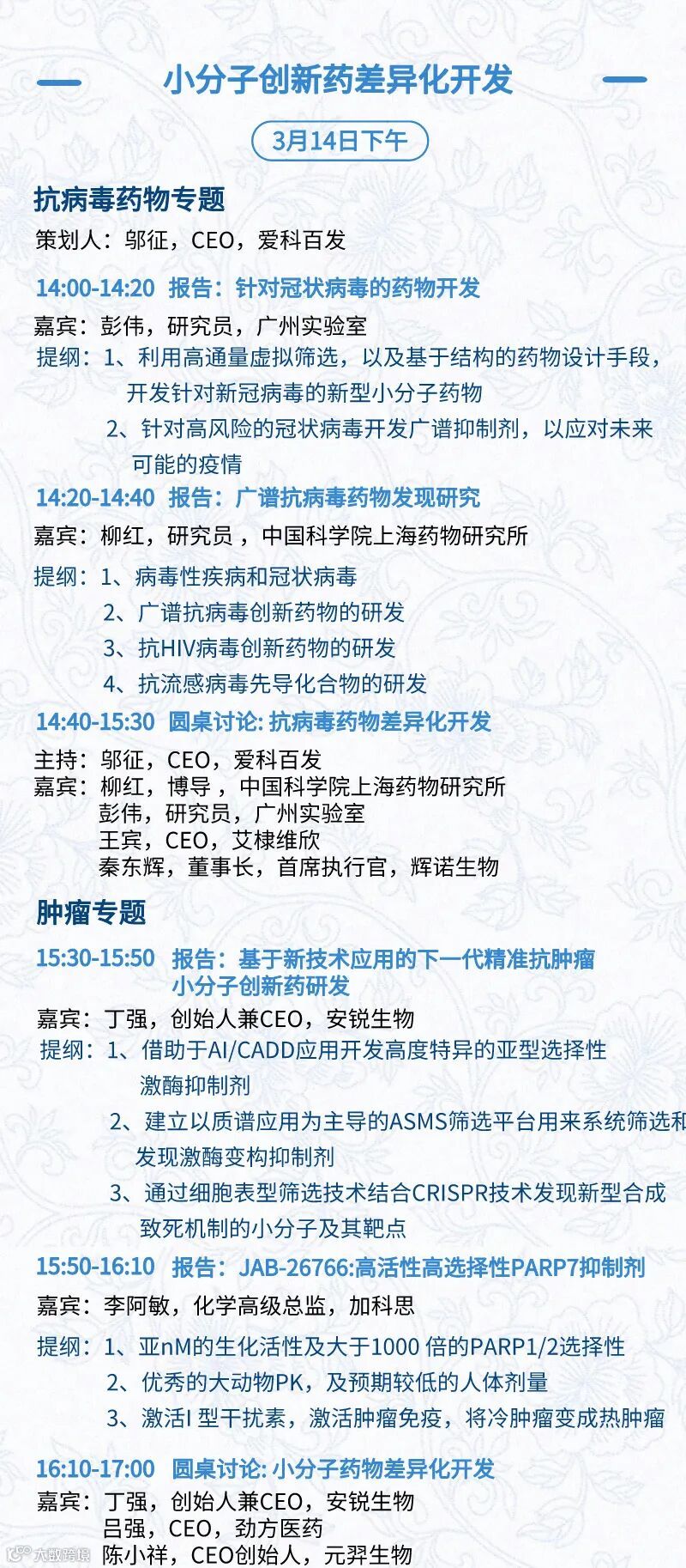 3月15日:开幕式、科学家峰会、细分赛道论坛(抗体、CGT、早研、临床、海外)、投融资&BD 论坛、中心舞台