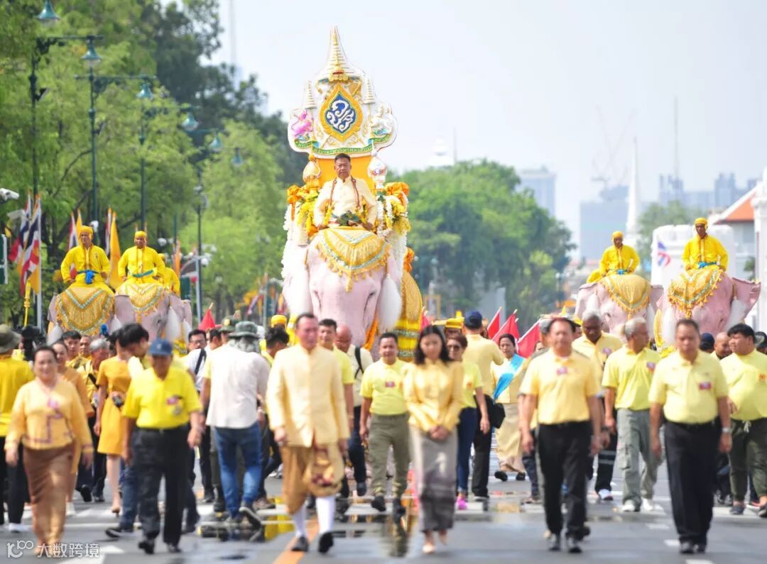 泰国十世皇的加冕典礼已于昨日圆满落幕,今日上午,大城府皇家大象基金会带领11头白象和500名身穿黄衣的象卫队来到曼谷大皇宫附近进行巡游,以表忠心。
