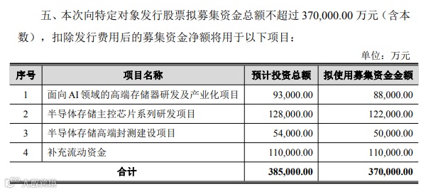 根据定增预案,此次募集资金将精准分配至四大核心方向,形成从芯片研发到封装测试的全产业链布局升级。其中,半导体存储主控芯片系列研发项目将投入12.2亿元,面向AI的高端存储器研发及产业化项目拟使用8.8亿元,半导体存储高端封测项目建设安排5亿元,剩余11亿元将用于补充流动资金,为项目实施提供稳定资金保障。