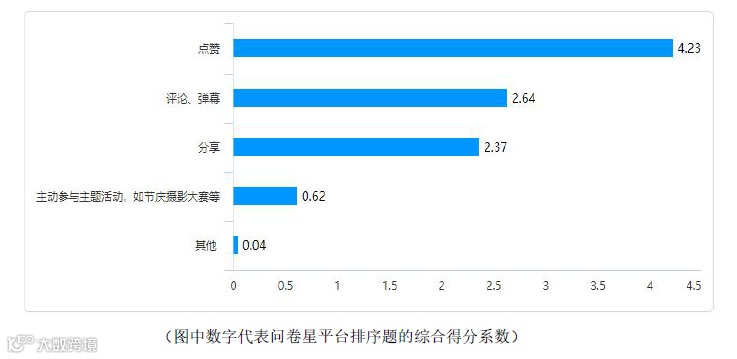 在新闻资讯阅读中,Z世代人群更喜欢在资讯阅览中通过点赞来表示自己的态度,点赞的互动行为更具有普遍性;其次则是评论和弹幕,而后则是分享。总体来看,新闻资讯阅读卷入度随着参与程度环节的增加而减少。