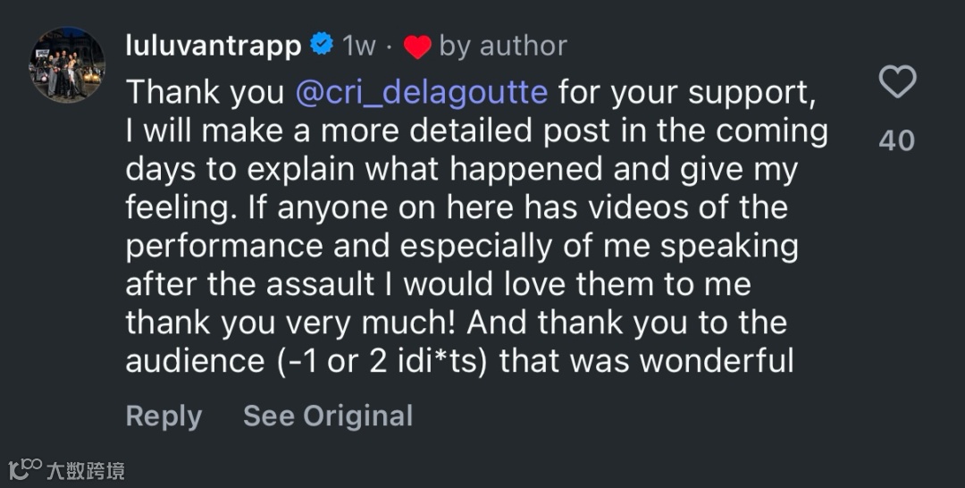 部分男性观众也表示震惊与反思,意识到“目光暴力”同样是性别压迫的一部分。Rebecca感谢了及时介入的安保人员,同时质疑摇滚圈所谓的“自由”:若对性暴力视而不见,自由便只是虚名[k]。