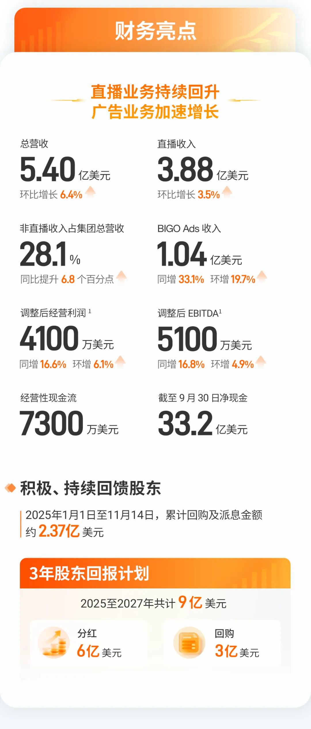 直播收入延续环比增长趋势,BIGO Ads增长势能持续爆发,同比强劲增长33.1%,其中第三方广告实现同比中双位数增长、环比25%增长。