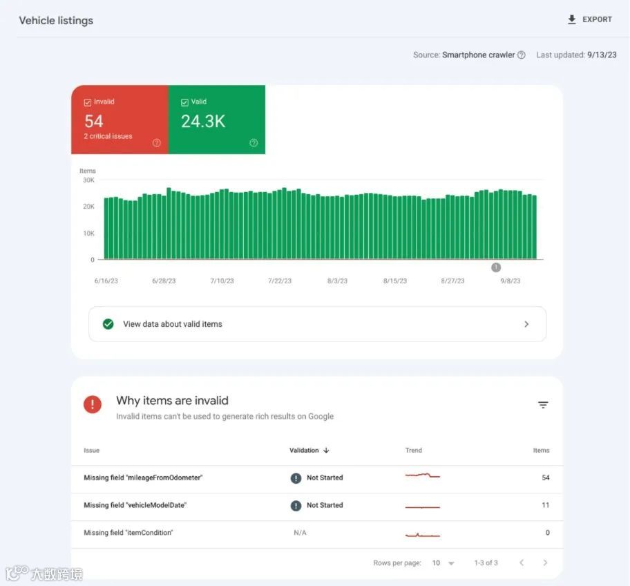 为了帮助汽车经销商监控该结构化数据标记的问题,GSC中也新增了汽车列表结构化数据报告,该报告显示了具有结构化数据的页面的有效和无效项。