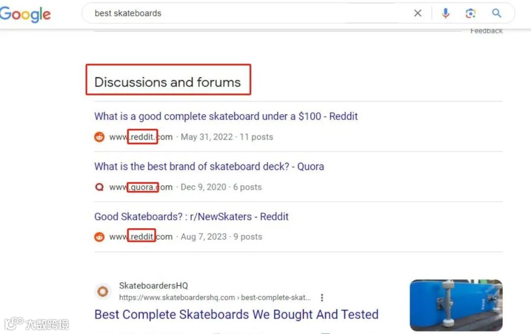 谷歌搜索结果页看到新的样式测试:Discussions and forums,样式中看到信息都来自于问答类或论坛类站点,结合近几个月问答/论坛类站点在搜索结果页中的可见性飙升,预测未来谷歌可能会加大这类站点的权重并提升其在搜索结果页中的展示。