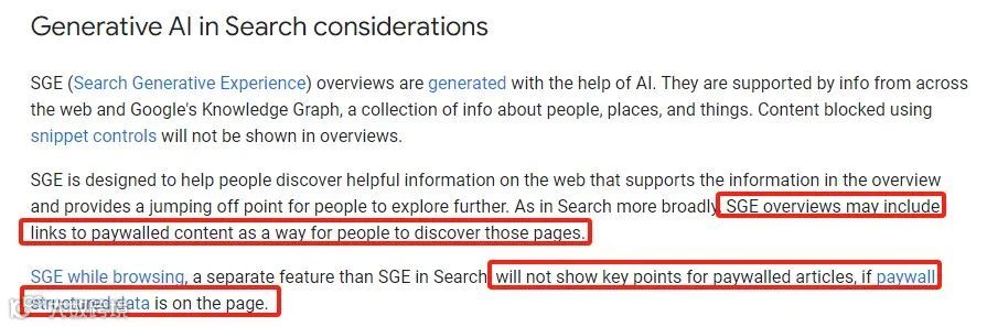 从谷歌的付费内容搜索开发者文档更新内容猜测,未来谷歌SGE内容可能会新增指向付费内容的链接。文档中写道SGE 概述可能包含指向付费内容的链接,作为人们发现这些页面的一种方式。但是如果不希望付费专区的内容在SGE中展示,可在对应内容添加付费专区的结构化数据。