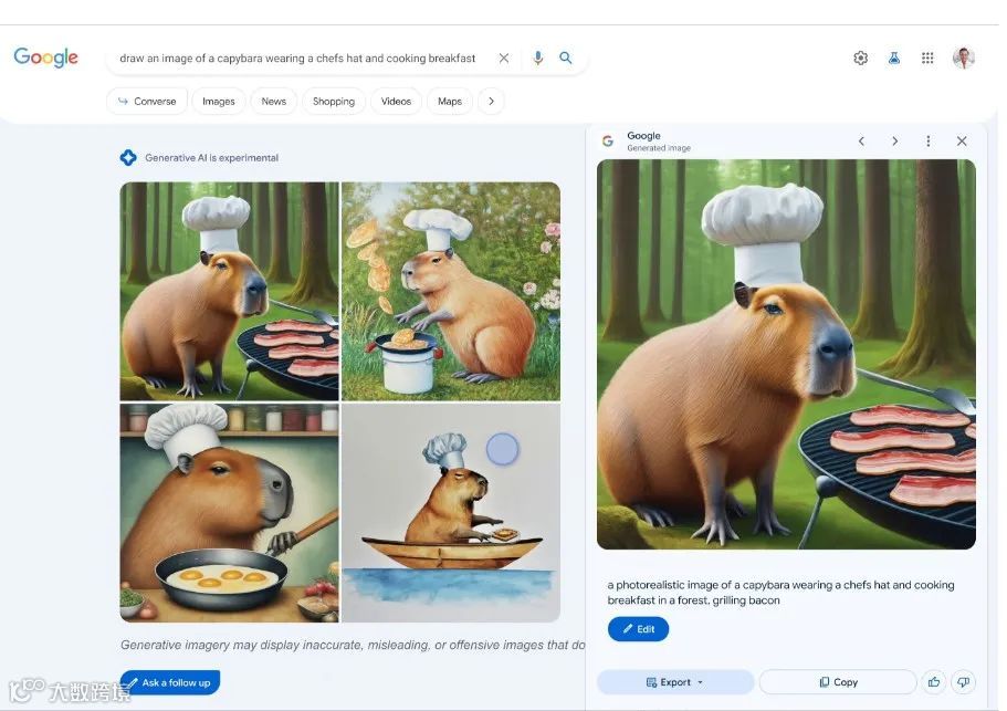 用户现在可以直接从Google搜索栏中输入指令在SGE位置生成 AI 图像。(要使用该功能,用户必须在Google Labs中启用SGE)