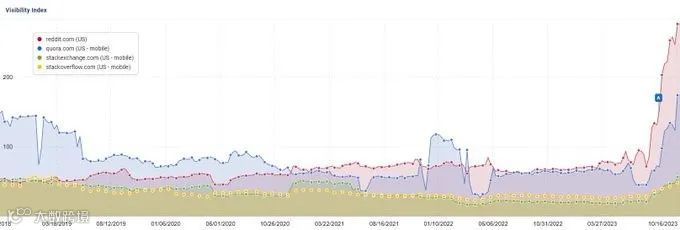 (图片展示为问答站的可见性指数变动情况——用于衡量网站在搜索引擎结果页面中的可见性程度的指标)