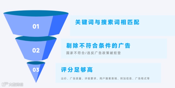 首先需要关键词与用户的搜索词相匹配,触发广告后,谷歌会剔除不符合条件的广告。如:国家定位不符合,违反了政策被拒登的广,然后对广告会有一些评分,根据广告的不同评分,展示在搜索引擎结果页的不同位置。