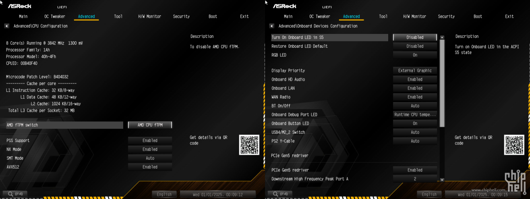 CPU特性子菜单,可调节一些CPU特性的功能开闭;板载设备子菜单,可选择开闭RGB,集成声卡,网卡,蓝牙等设备,并可指定首选显示输出设备.