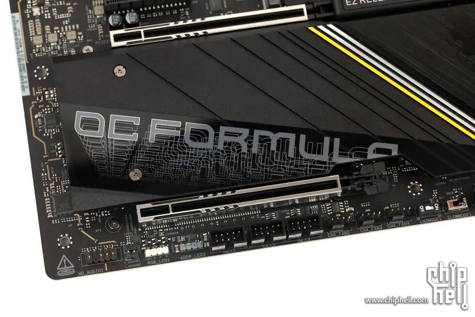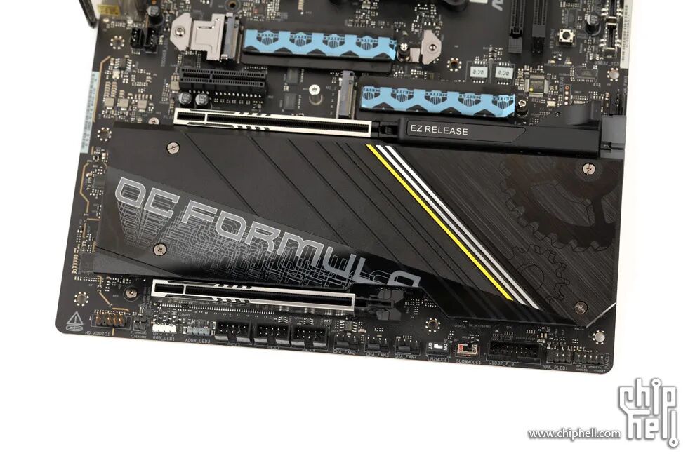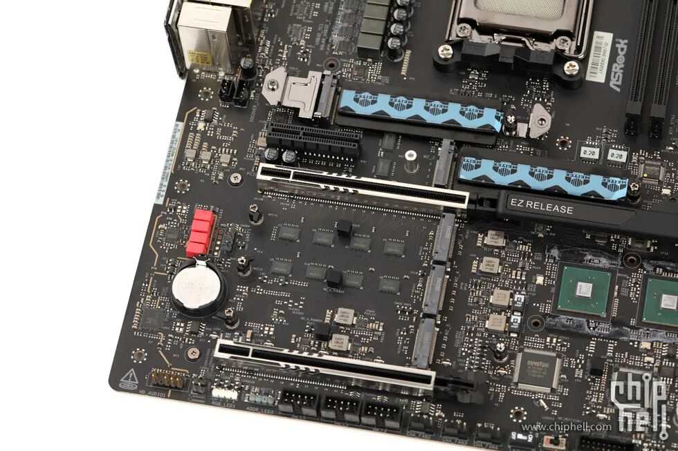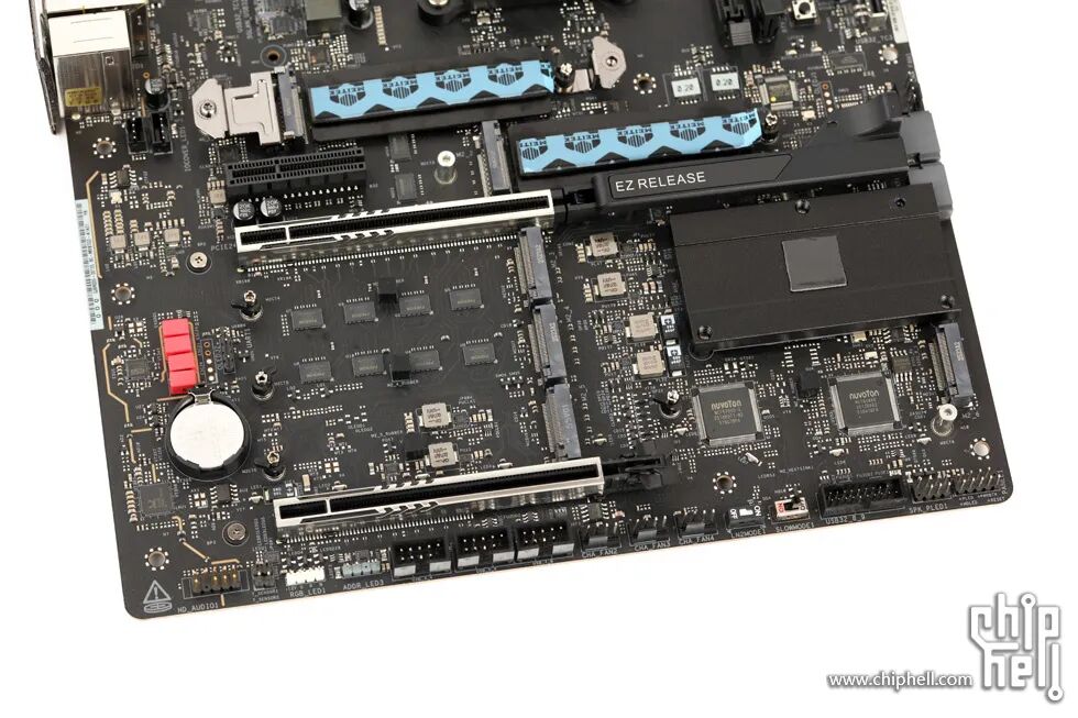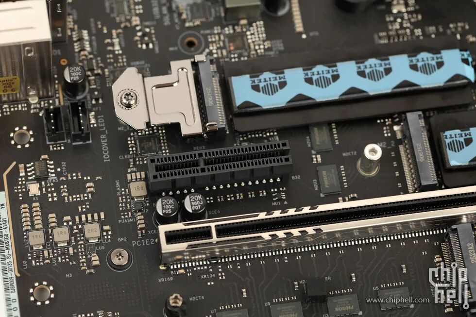 主板中下部为PCIe扩展区,M.2 SSD插槽以及芯片组区域.