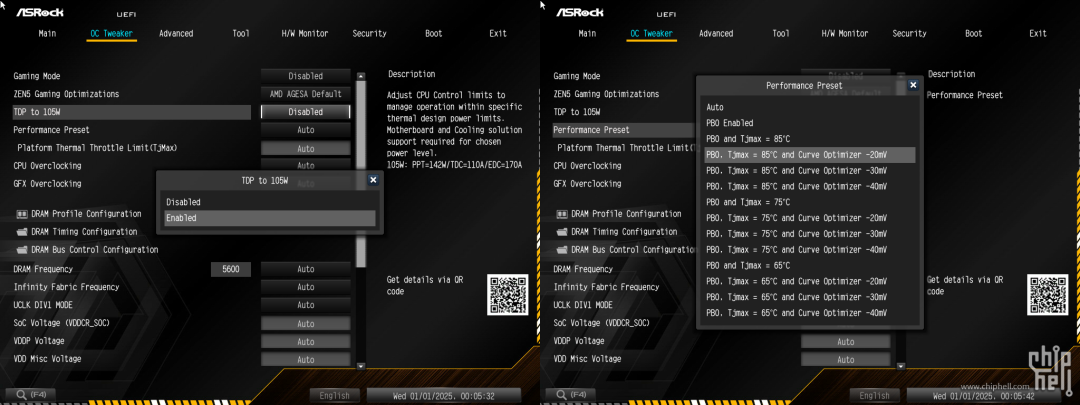 设有105W的快速TDP设定开关;以及针对Cinebench的性能Boost提升模式,以及预置多种的组合式PBO性能优化档案.