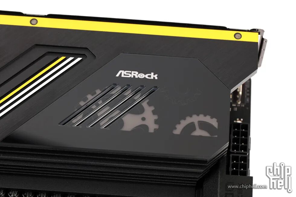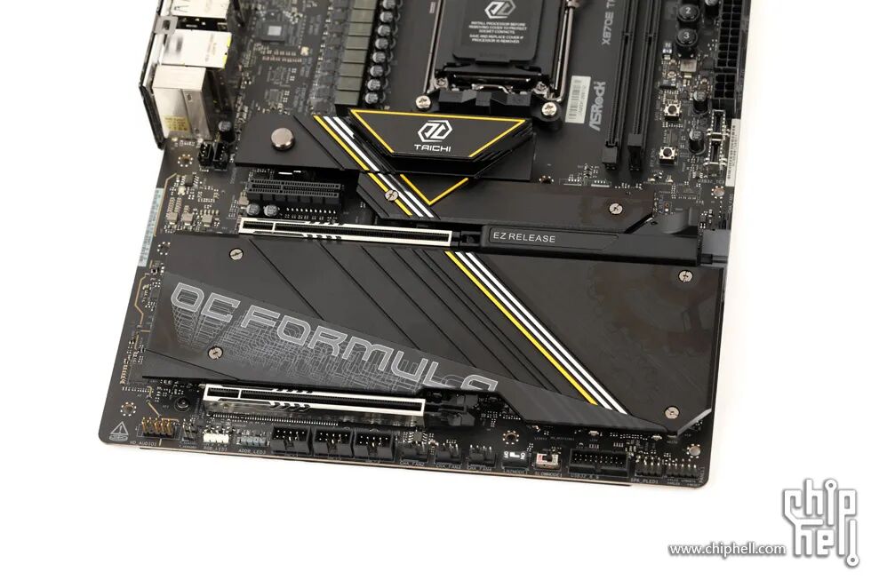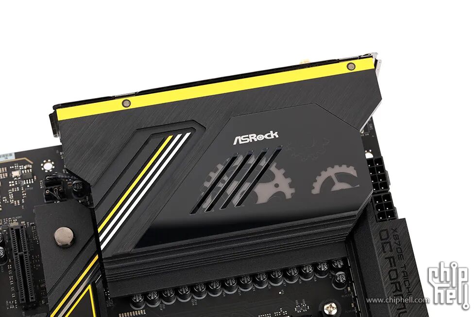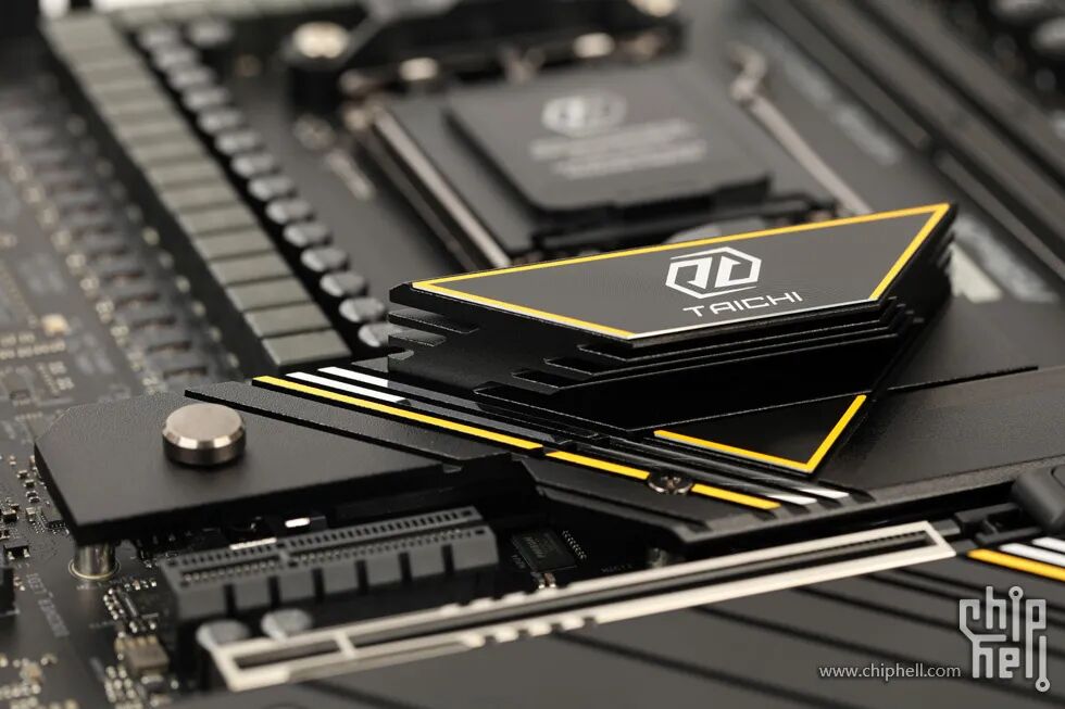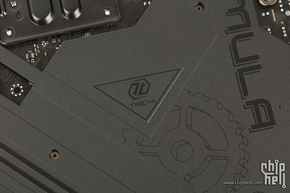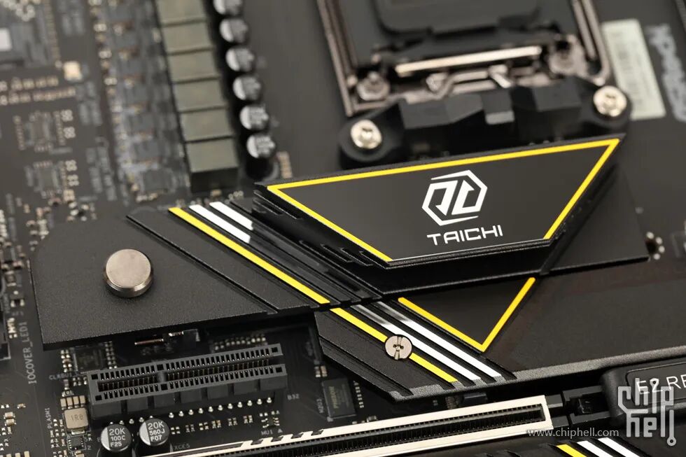 主板中部的独立式M.2散热装甲,表面斜向条纹以及Taichi系列LOGO的装饰.