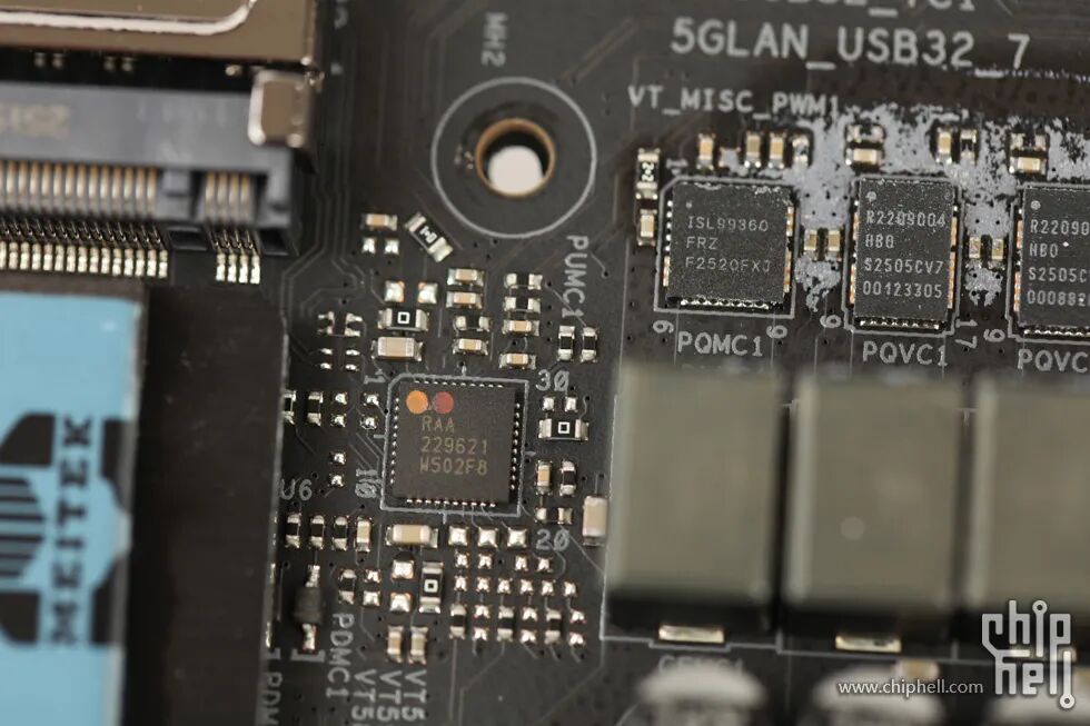 1项Misc供电,搭配1颗ISL99360 Dr.MOS (60A).供电主控为RAA229621.