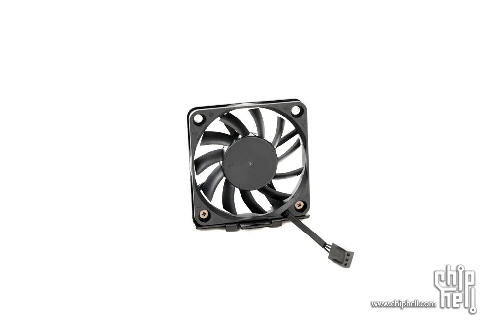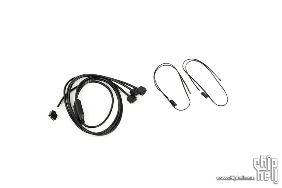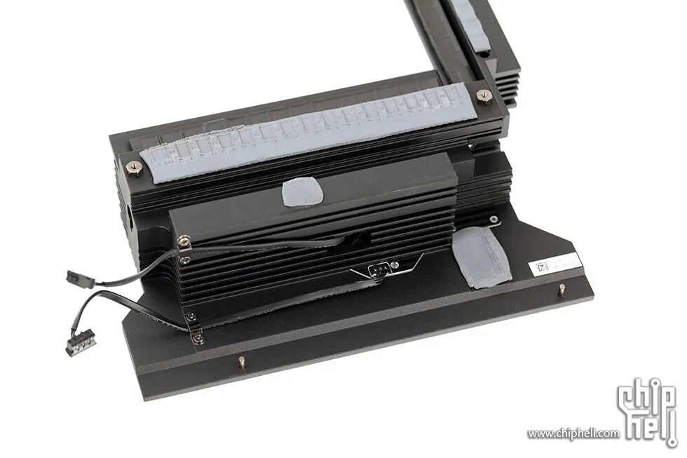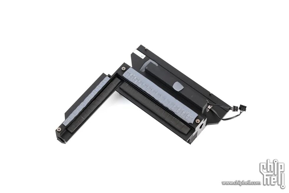 在散热模组内侧,可以看到内部固定的散热风扇的连接线孔位,但风扇无法拆卸.另一条为RGB灯线.