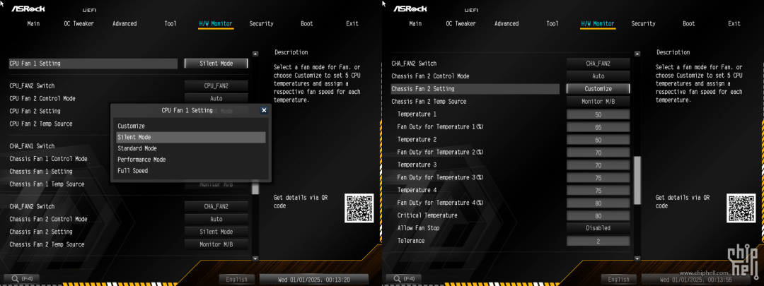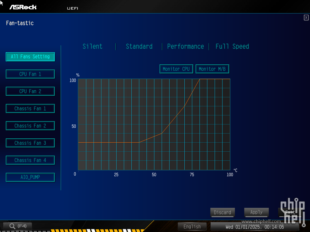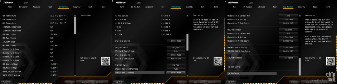 每个接口都预设自定义/安静/标准/性能/全速,共五个风扇模式,除CPU Fan接口固定温度来源以外,其余接口均可自定义温度来源,并都支持风扇停转技术.手动模式下提供4点曲线调节,且机箱风扇可以切换成连接水泵用途.