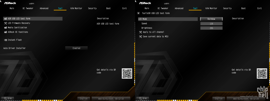 Tool界面,提供板载RGB灯控调节和重置,以及BIOS刷新工具,SSD安全擦除功能等.