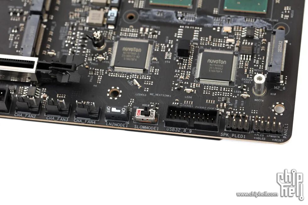 主板底部右侧,设有3个机箱风扇接口,1个液氮切换按钮,1个慢速启动开关,1个前置USB 5Gbps接口,1个扬声器接口以及开机跳线.