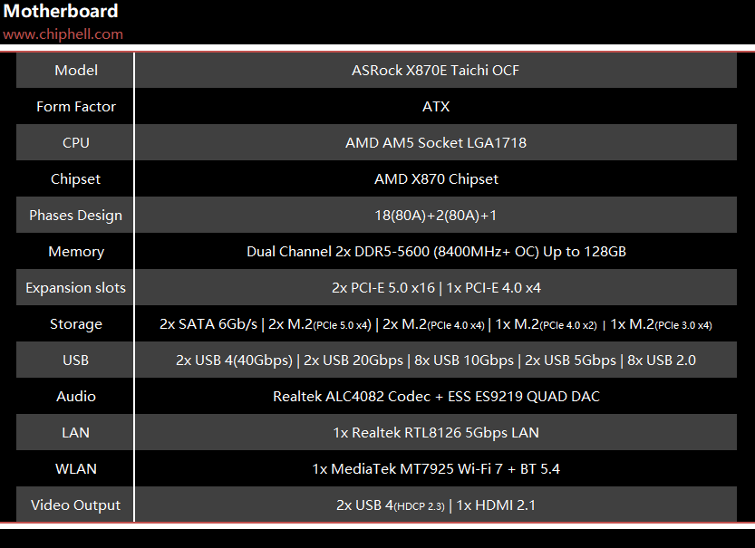 本次的ASRock X870E Taichi OCF为ATX规格主板,配备两条DDR5内存插槽,最大容量为128GB,最高频率可OC至8400MHz+.PCIe拓展性上配备两条PCIe 5.0 x16和一条PCIe 4.0 x4插槽.存储方面板载了6个M.2 SSD插槽,其中两个支持PCIe 5.0 x4规格,以及搭配2个SATA接口.其他外围设备方面,音频方案为Realtek ALC4082 + ESS ES9219 QUAD DAC的组合,网络方面为有线5Gbps和Wi-Fi 7的无线网络解决方案.整体规格属于旗舰板中的主流水平.