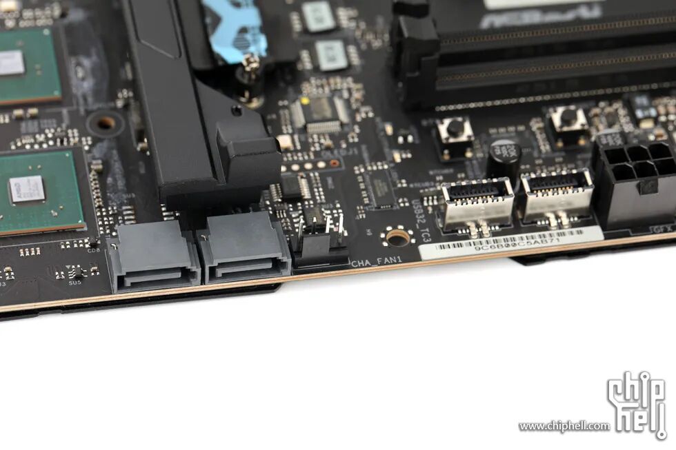 主板右下角,配有2个SATA3接口,1个机箱风扇接口,以及2个前置USB 20Gbps Type-C接口(均支持PD充电,上方支持最高36W,下方支持最高15W).