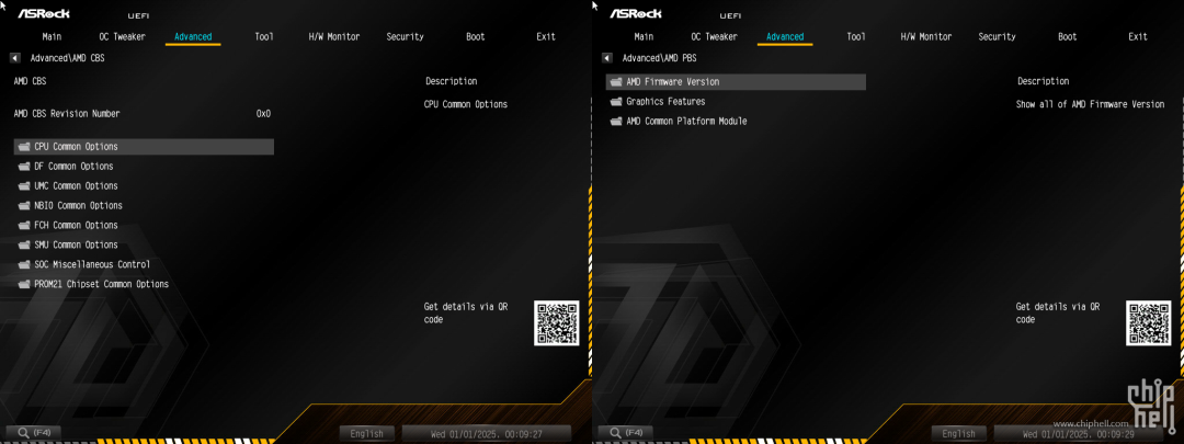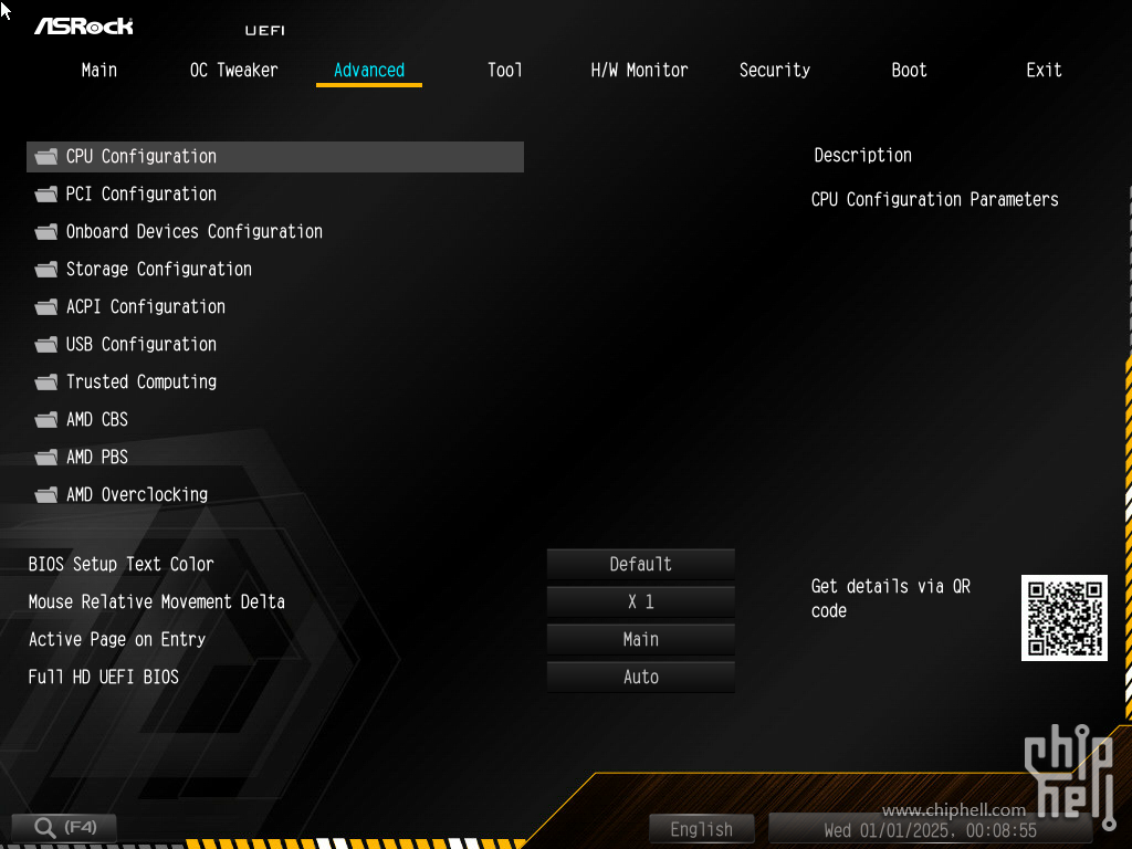 Advanced界面,可对CPU特性,存储设备,USB,板载设备,信任模块等进行设定.页面中还提供了AMD CBS,AMD PBS和AMD原厂超频选项菜单等杂项.