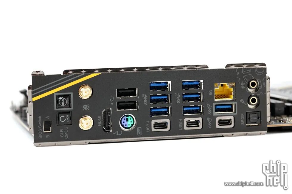 后置I/O接口部分.提供1个双BIOS切换按钮,1个CLR CMOS按钮,1个BIOS Flashback按钮,无线网卡双天线接线端,1个HDMI 2.1接口,1个PS/2接口,2个USB 2.0接口,2个USB 4接口(支持HDCP 2.3集显输出), 1个USB Type-C 10Gbps接口,7个USB 10Gbps Type-A接口,1个5Gbps有线网口,以及一组2个3.5mm+1个S/PDIF光纤的音频输出组合.