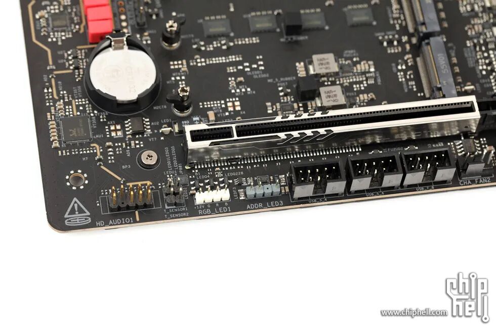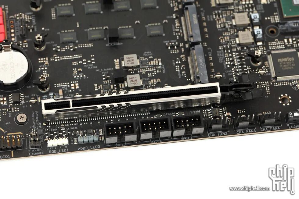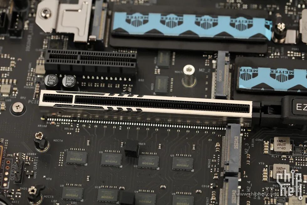 最下方同样由CPU提供的加固型PCIe 5.0 x16全长插槽.