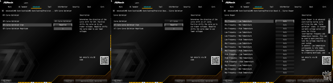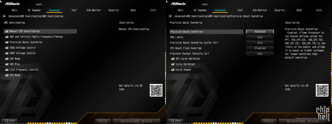 提供AMD原厂超频选项菜单,例如经典PBO菜单,除了自动和开闭以外,还开放高阶的手动调教模式,以及Curve优化修正.