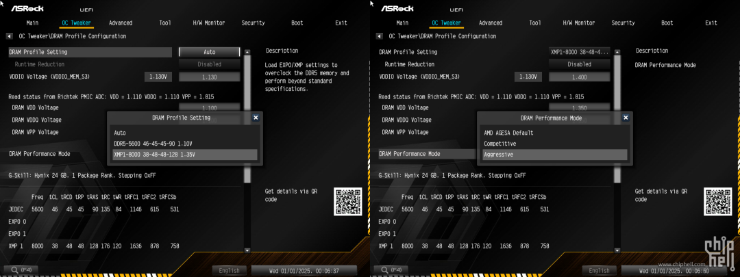 内存的规格显示和XMP/EXPO开关位于DRAM Profile Configuration子菜单内,并设有2个等级的内存性能提升模式可供选择.