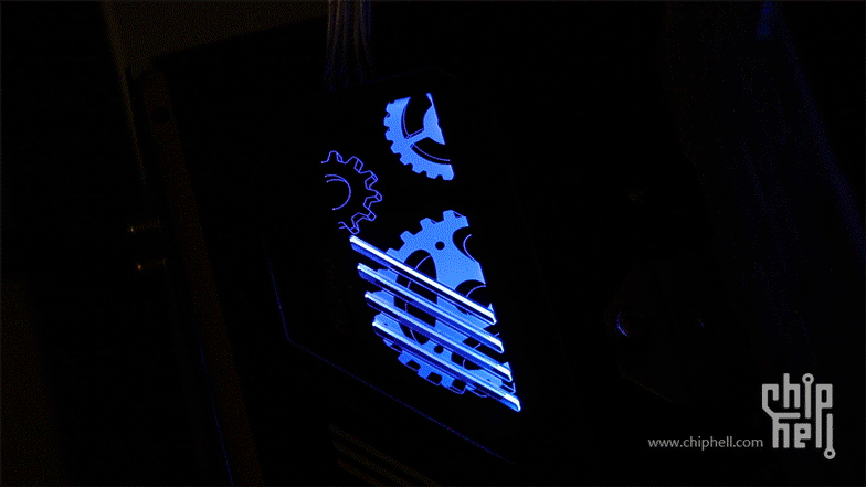 最上方为黄色条纹,中间为深灰色拉丝面板,左侧为斜向装饰条纹,右侧设有散热开孔以及文字图案装饰,同时在下方还设有RGB灯珠.
