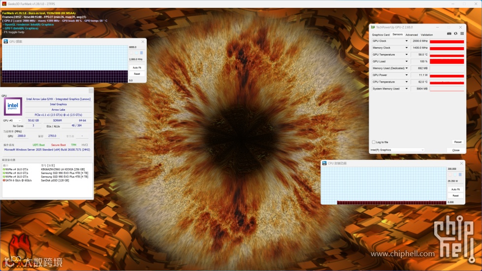 核显满载烤机15分钟,使用HWiNFO读取核显频率,频率稳定为2000MHz。GPU温度58摄氏度,功率为11W左右。