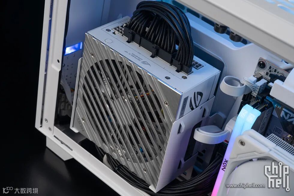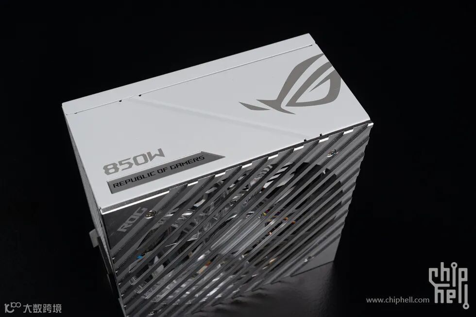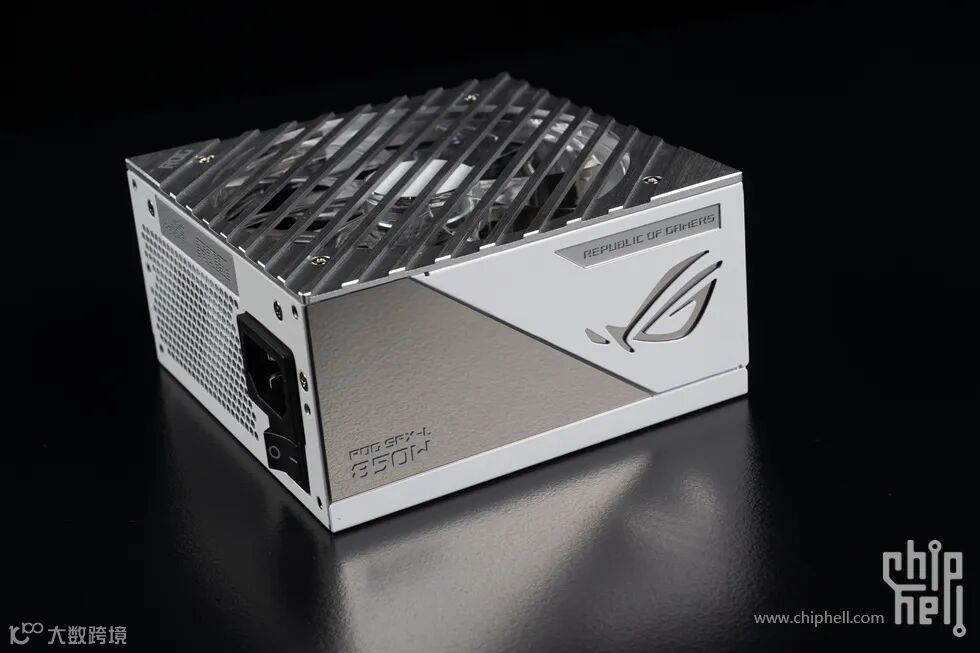 电源的侧面也基本沿用了ROG THOR系列的设计,但没有用上ROG THOR系列的功率计,因此银色的部分就是一块单纯的镜面,配合白色的区域形成一个银白撞色设计。