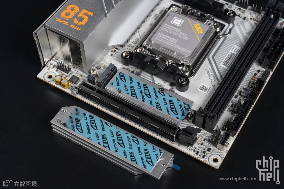 纯白色PCB主板,搭配大面积一体化的银色寒霜合金散热装甲,七彩虹经典的银白黑配色,其中马甲上印有85橙色LOGO。