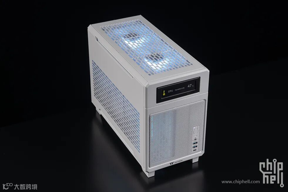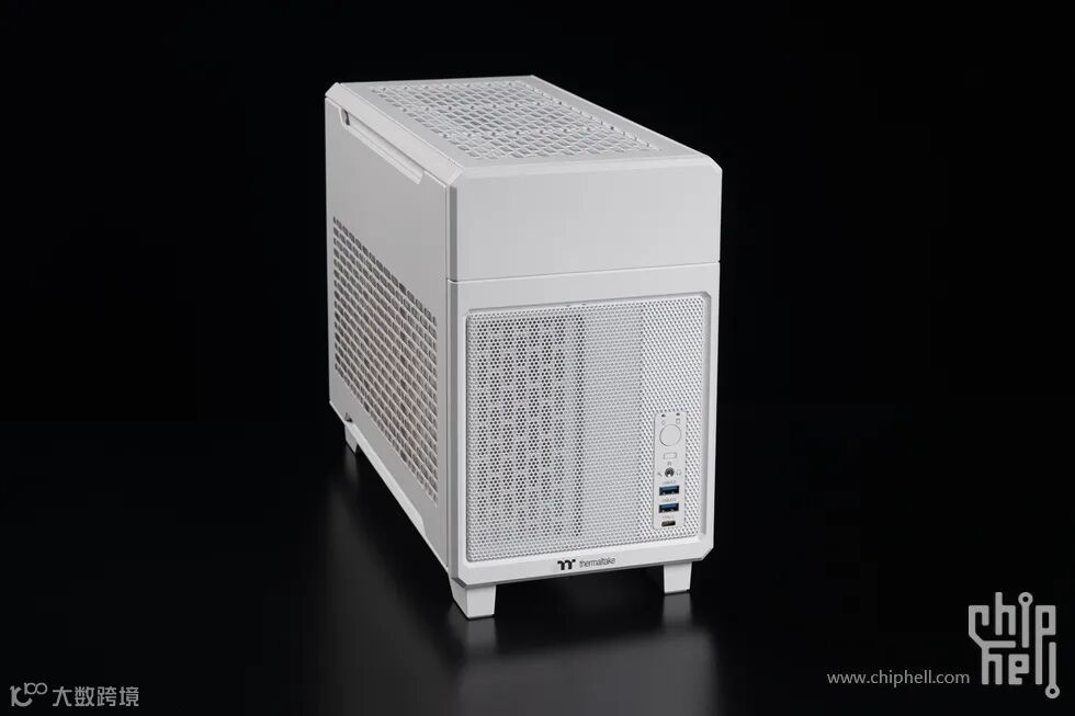 机箱主体采用 SPCC 钢材打造,表面经过磨砂处理,触感细腻且不易沾染指纹。正面设计简洁,印有 Tt 的品牌 Logo,两侧则是大面积的冲网孔,既保证了进气量,又为机箱增添了一丝工业风质感。