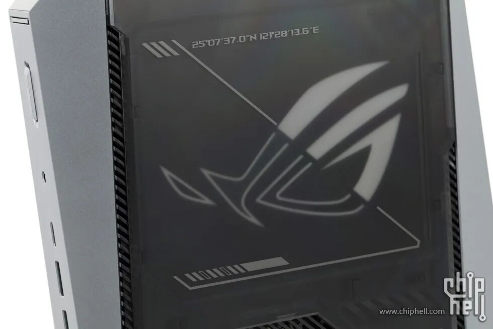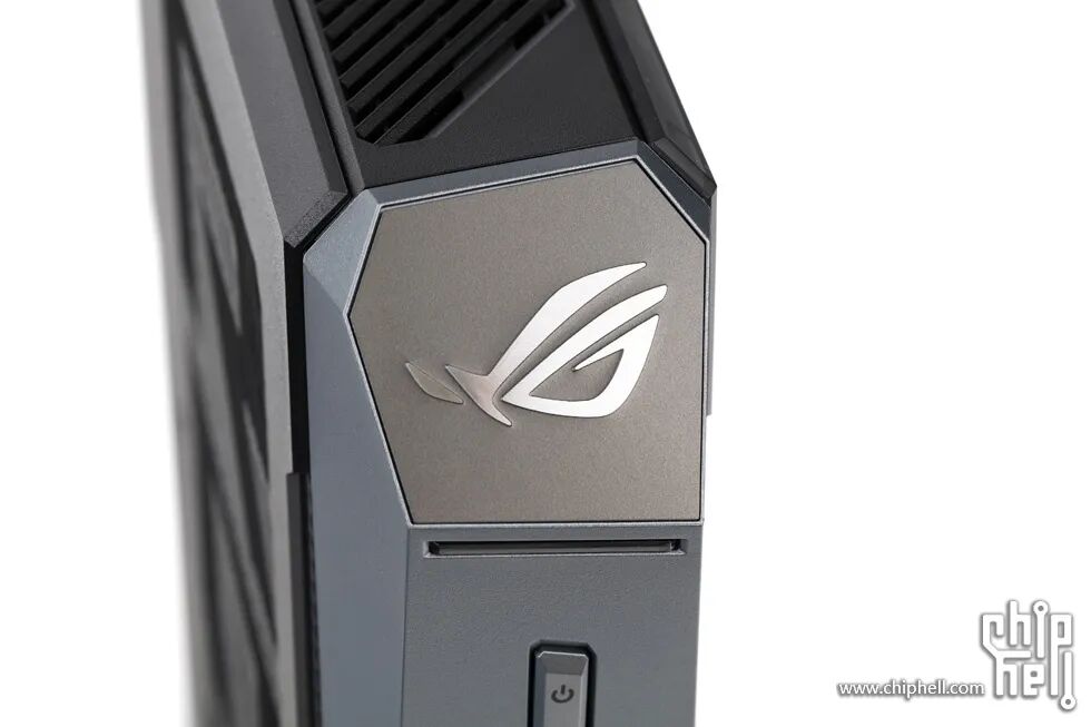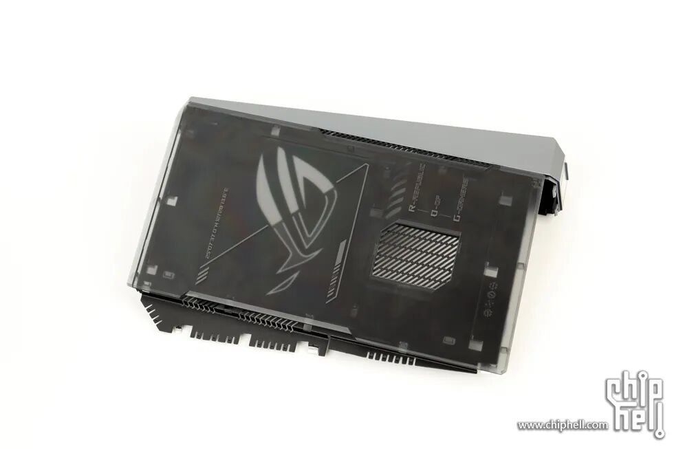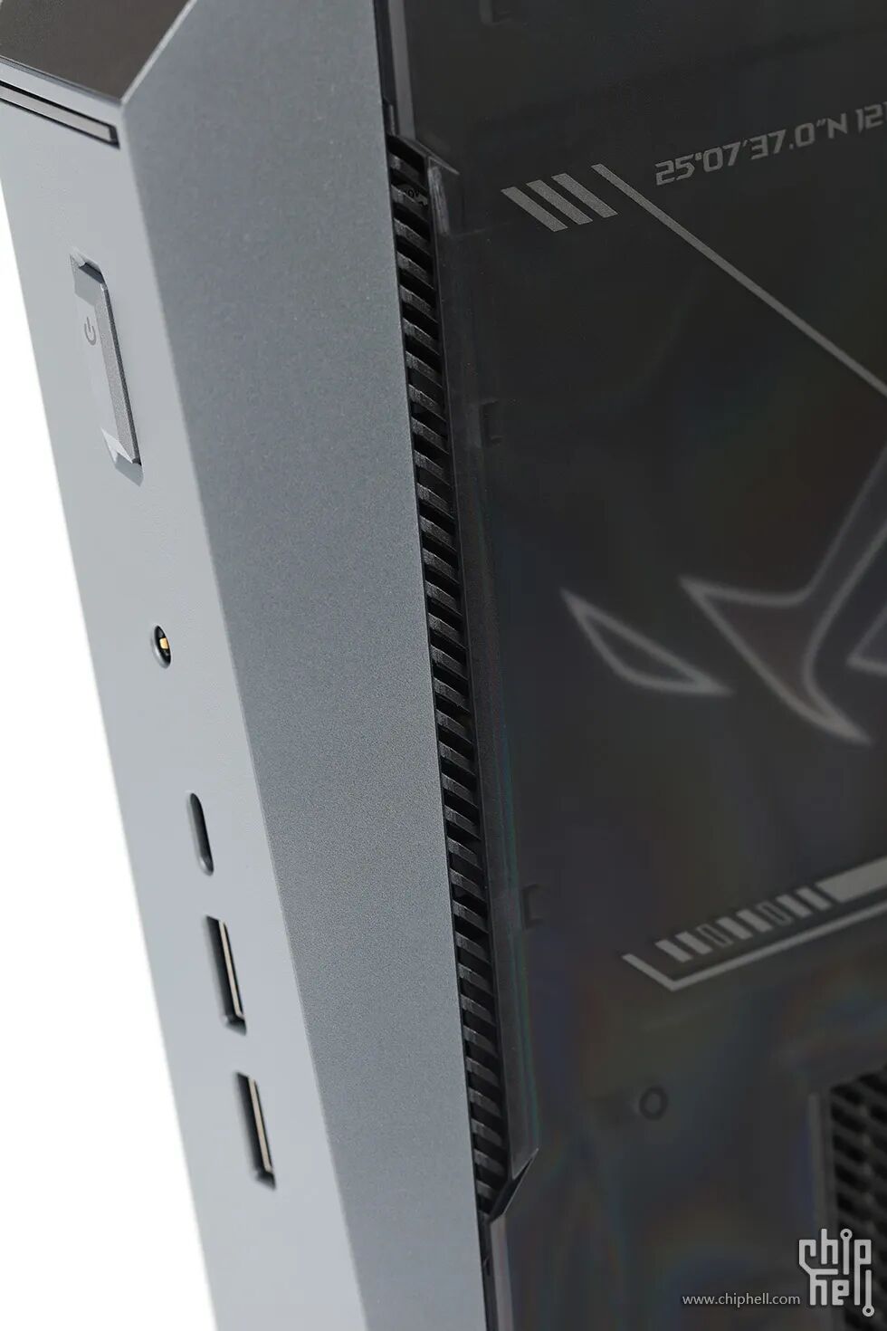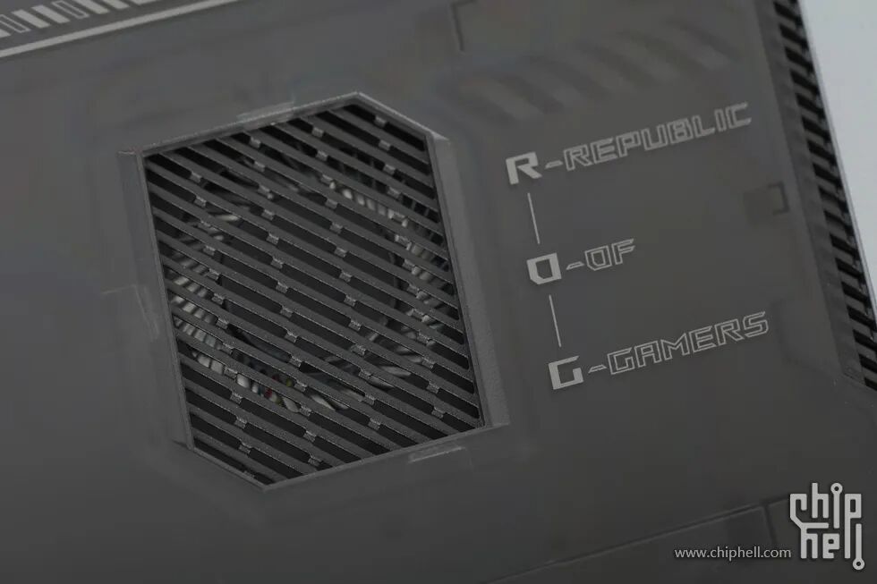 在ROG之眼下方,则配有一个外露式的风扇开孔区域,在右侧设有ROG装饰字体.