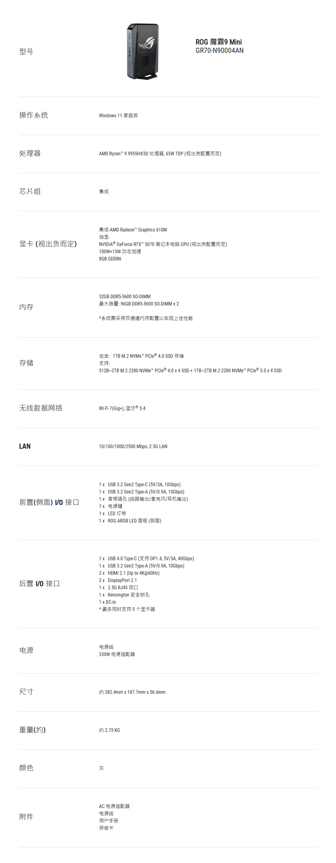 本次收到的ASUS ROG GR70 MiniPC搭载了AMD Ryzen 9 9955HX3D处理器以及NVIDIA RTX 5070 Laptop显卡,内存配置为32GB DDR5 5600MHz,搭配一块1TB的NVMe M.2 SSD存储.其余参数请参考下图.