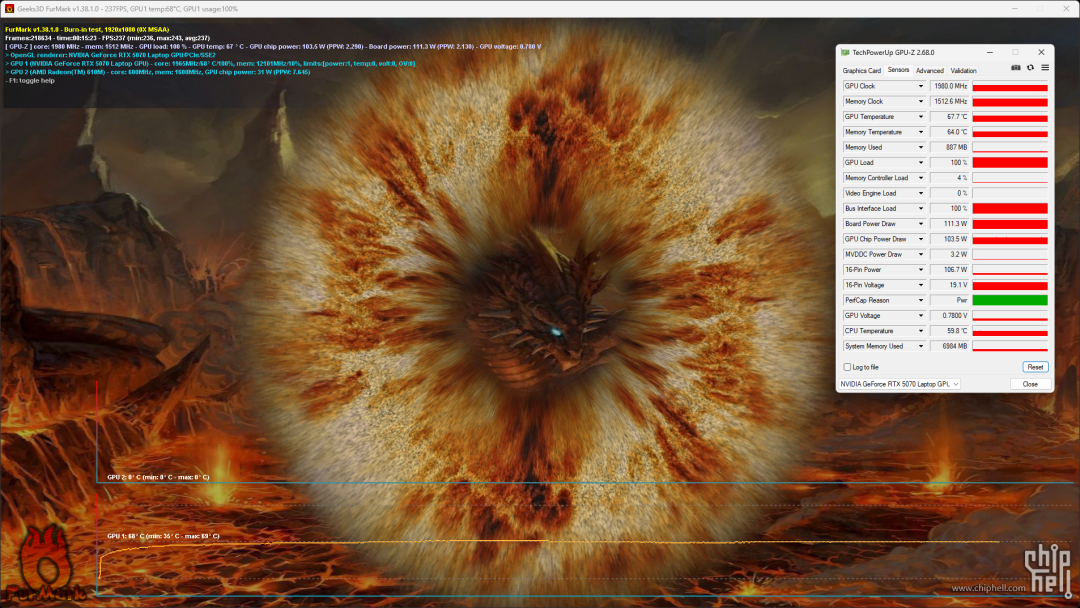 单烤GPU(Furmark)满载15分钟后温度为67.7摄氏度左右.频率为1980MHz.烤机时TDP可稳定输出111.3W左右功率.
