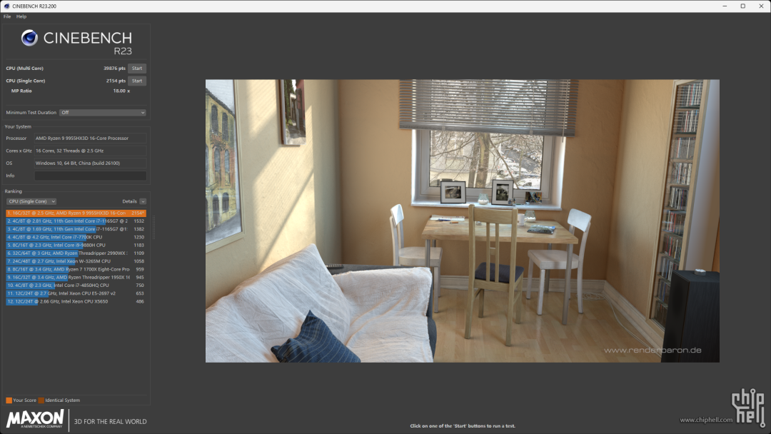 Cinebench R23测试结果为39876pts,单核心为2154pts.