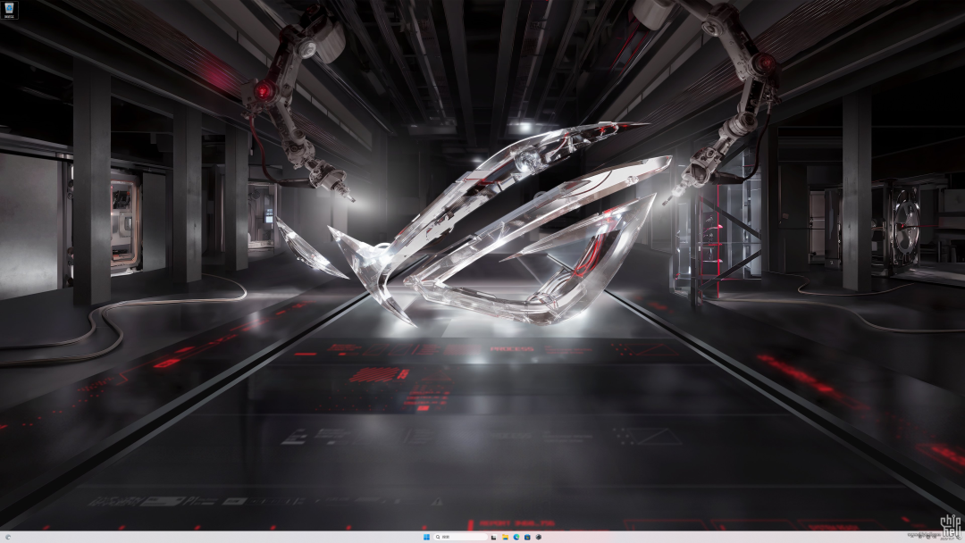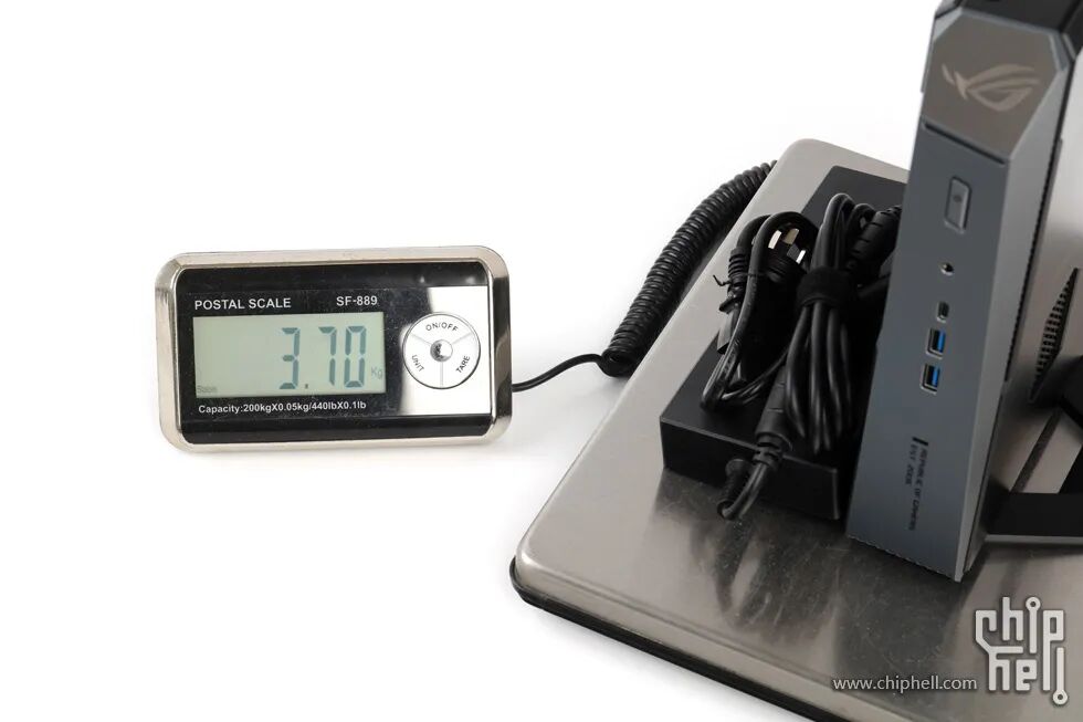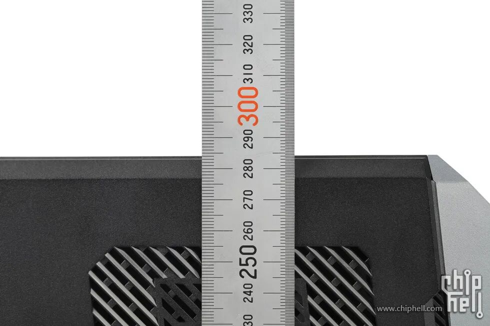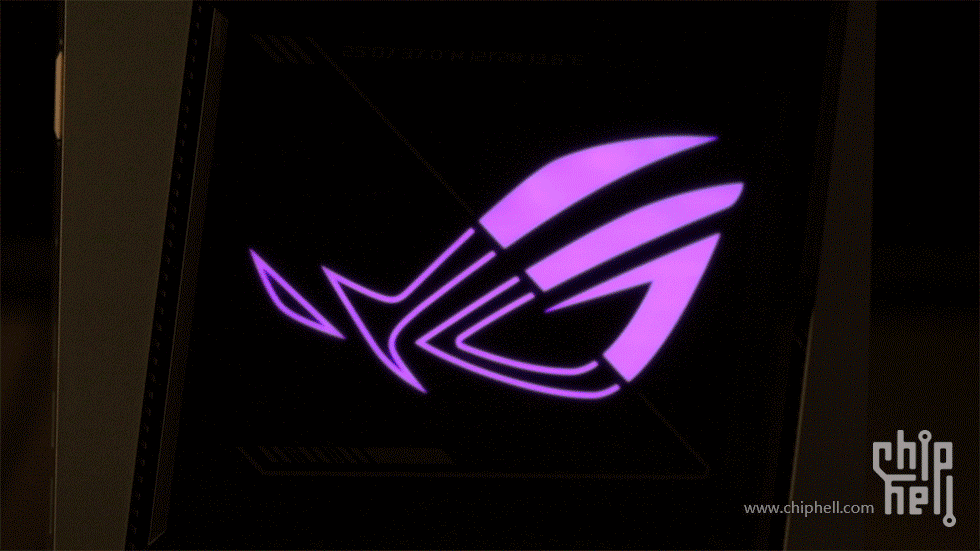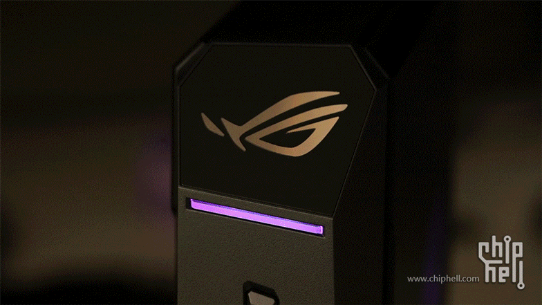 机器正面,斜切状的ROG之眼,下方还设有一条细长的RGB灯带开孔.
