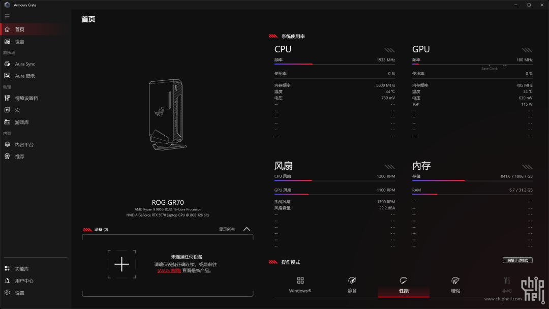 首页提供一个基本的运行状态概览,并可对某些保存的项目选项进行快速操作.在右小角处的模式操作提供了Windows,静音,性能,增强以及手动共5种预设模式.