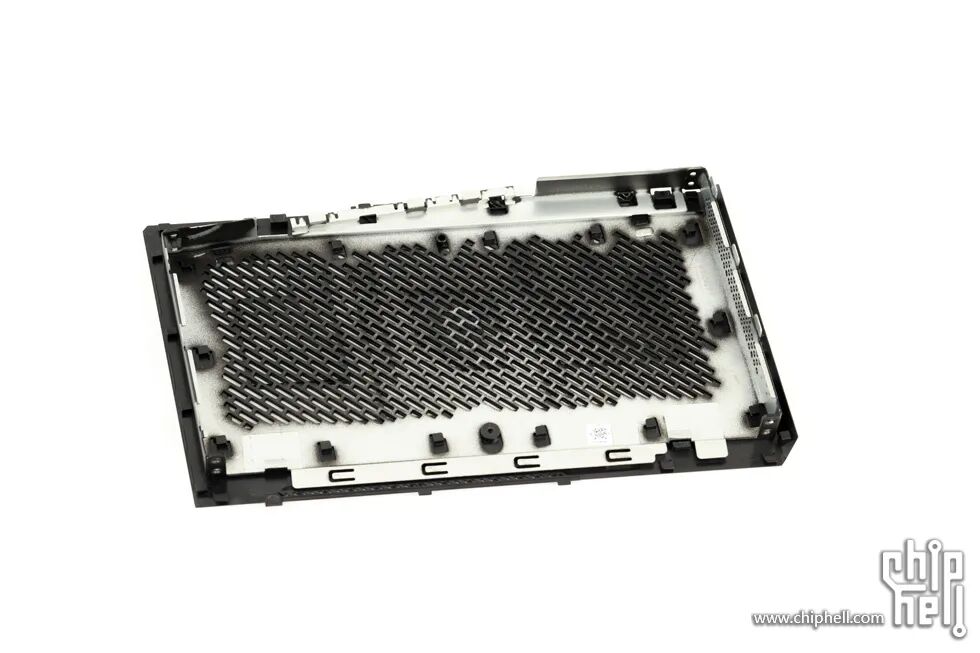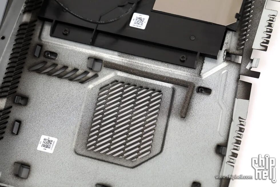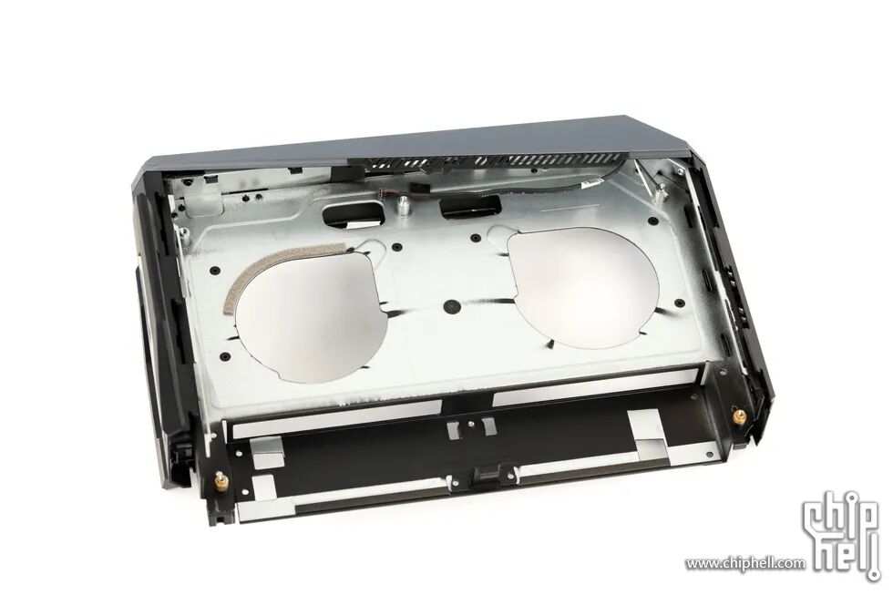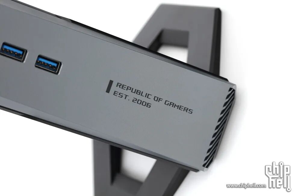 正面下方的ROG装饰字体,而最下方与后部同样的斜切装饰开孔.