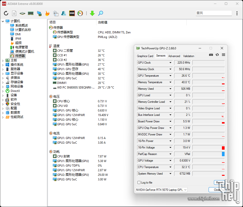 CPU的待机温度为32摄氏度左右,GPU为27摄氏度左右.