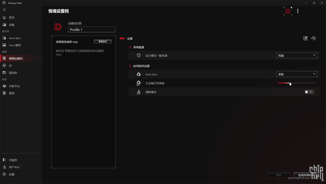情景设置档页面,可对系统运行模式以及Aura Sync灯效,自动清除缓存等设定进行更改,并可创建多个档案以连接不同的应用程序.