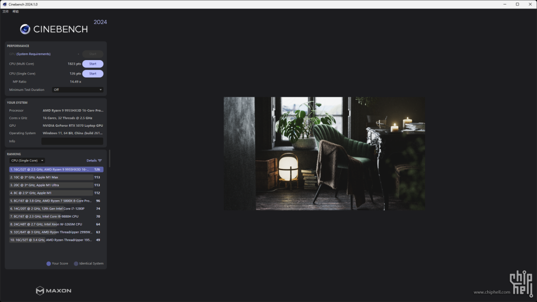 Cinebench 2024测试结果为1823pts,单核心为126pts.