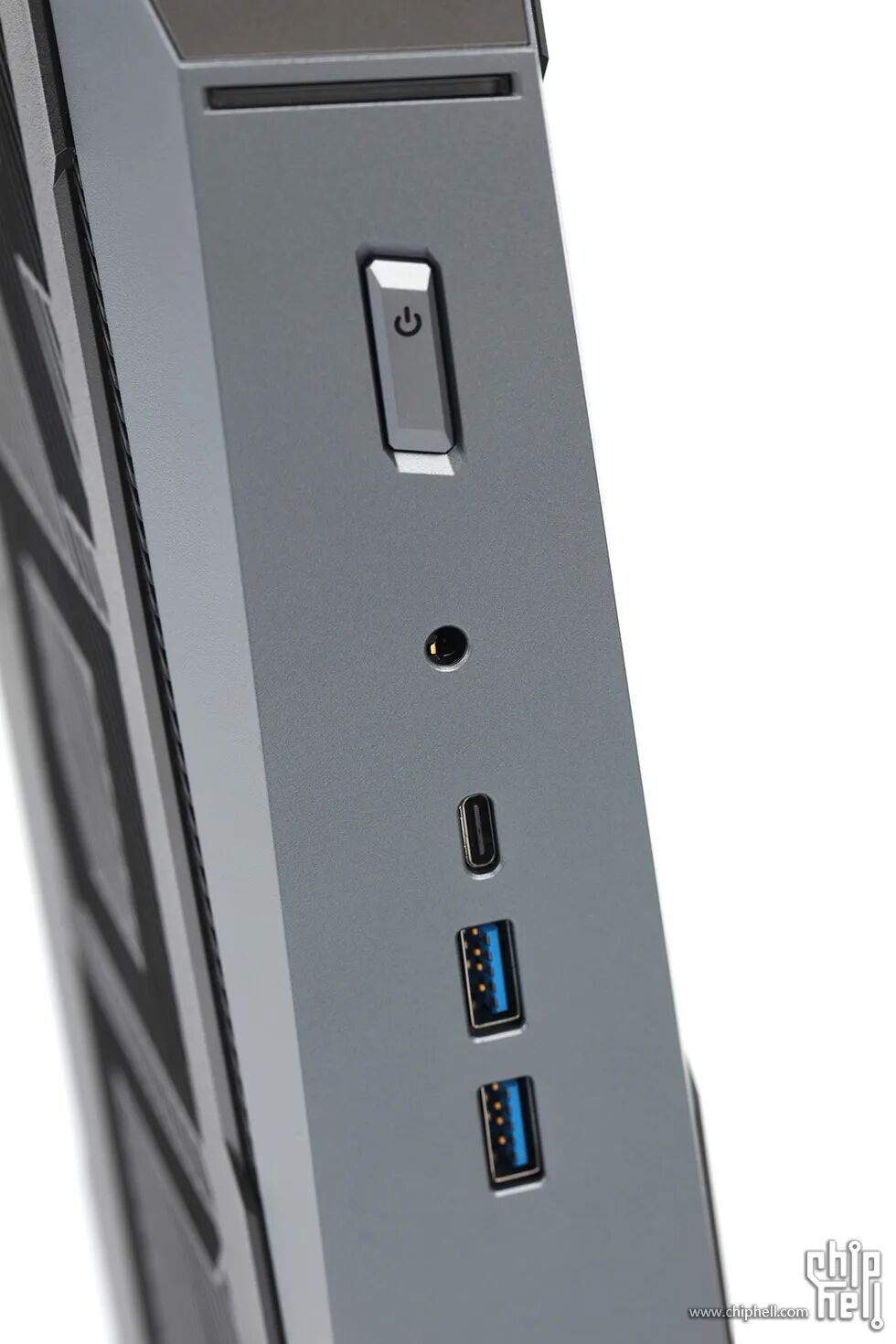 前置I/O区域,设有1个电源键,1个3.5mm多用途音频接口(线路输出/麦克风/耳机输出),1个USB 10Gbps Type-C接口,2个USB 10Gbps Type-A接口.